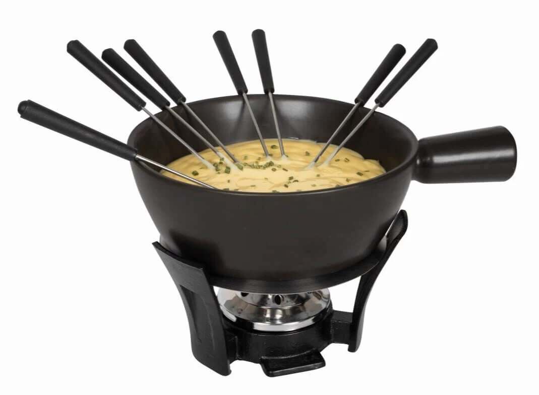 Met de Boska Nero kaasfondueset maak je kaasfondue voor een groot gezelschap. De zwarte keramieken fonduepan heeft een inhoud van 2,2 liter, dit staat gelijk aan 1,5 kilo kaasfondue. Ook is de pan vuurvast en kan daardoor worden gebruikt om de kaasfondue op te warmen op het gasfornuis. De pan is vaatwasmachinebestendig. De kaasfondueset bevat ook 8 stevige vorken van roestvrijstaal met eikenhouten handvat en een gietijzeren onderstel. De kaasfondue blijft warm door de fonduebrander in het onderstel, geschikt voor vloeibare brandstof en brandgel.