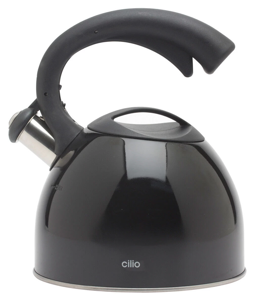 De zwarte fluitketel van Cilio is gemaakt van roestvrij staal en heeft een inhoud van 2,5 liter. Met een diameter van 20 cm en een capsulebodem met aluminium is de ketel geschikt voor alle warmtebronnen, inclusief inductie. Voorzien van een handgreep.