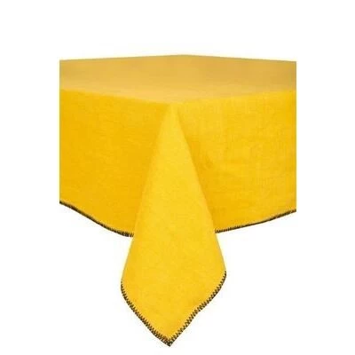 Haal het luxe gevoel in huis met het Letia-tafelkleed van Haomy! Het linnen design heeft een afmeting van 170 x 250 cm en heeft een saffraangele kleur. Het tafelkleed is voorzien van een effen patroon en van een zwarte bies voor een speels accent. Breid uw collectie uit en combineer het Letia tafelkleed met de andere Letia-producten van Haomy. Gebruik het tafelkleed als bescherming en/of versiering van uw eettafel.