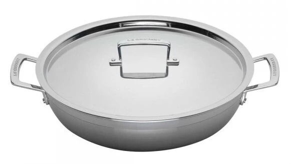 De Le Creuset Magnetik lage braadpan met deksel heeft een diameter van 30 cm, een inhoud van 4,8 liter en is aan de binnenkant voorzien van een sterke anti-aanbaklaag. De pan heeft een aluminium tussenlaag, ingekapseld in roestvrij staal, die de warmte gelijkmatig geleidt van de bodem tot aan de rand. De grepen zitten aan de pan geklonken, zodat deze stevig vast zitten.