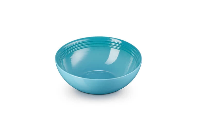 De ronde schaal van Le Creuset is gemaakt van caribbean blue, blauw, geglazuurd aardewerk. De diameter van de schaal is 24 cm en heeft een inhoud van 2,2 liter. Gebruik de schaal om bijvoorbeeld een salade in te serveren.