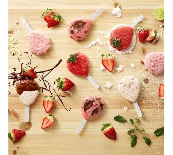 De rode Fun & Sun ijsvormen van Lékué zijn vervaardigd uit silicone en kunststof. Met de vorm maakt u eenvoudig ijslollies in de vorm van een aardbei. Elke ijsvorm heeft een inhoud van 95 ml is voorzien van een deksel om de ijsvorm af te dekken. De vormen worden geleverd in een set van vier stuks.