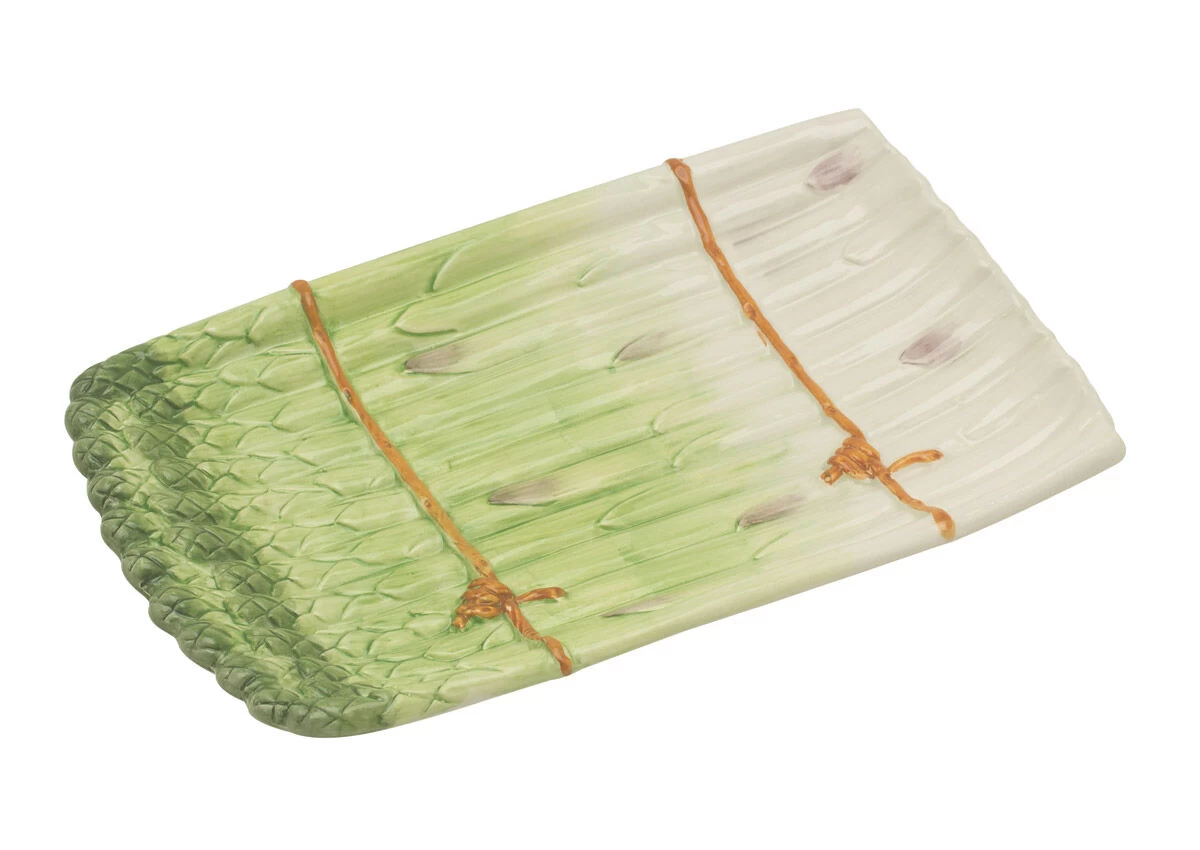 De Oldenhof aspergeschaal is gemaakt van aardewerk, heeft een lengte van 34 cm en is 21,5 cm breed. Gebruik de groene schaal met afbeeldingen van asperges voor het serveren van zowel groene als witte asperges.