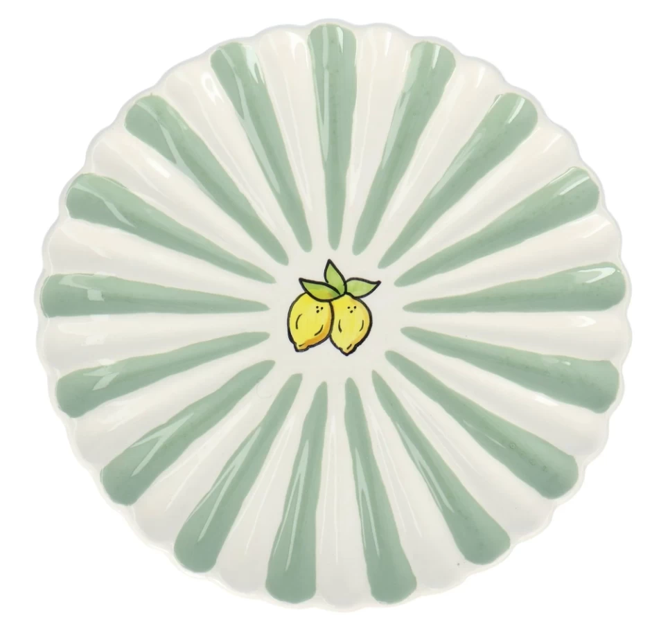 Het Oldenhof ontbijtbord is aan de boven- en onderkant geglazuurd in het wit-groen met een tekening van citroenen. Gebruik het bord voor het serveren van verschillende kleine gerechten. Reinig het bord met warm water en afwasmiddel.
