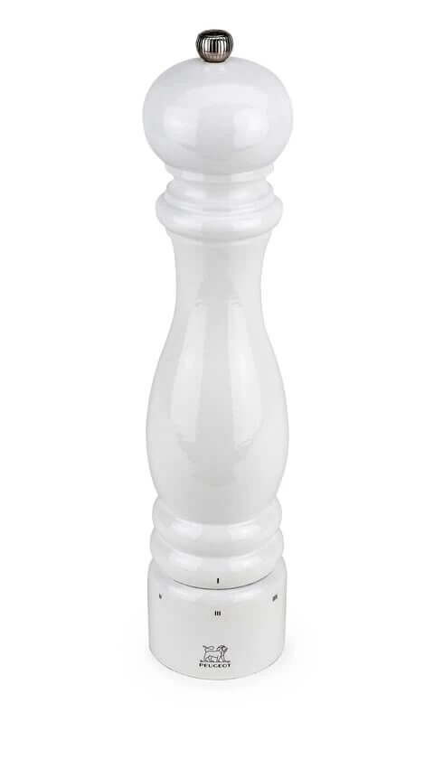 De Peugeot Paris laqué blanc pepermolen heeft het klassieke Peugeot model, is uitgevoerd in wit gelakt hout en heeft een hoogte van 30 cm. Het maalwerk in de molen is vervaardigd uit roestvrij staal. De molen is voorzien van u-select, waarmee u de grofheid van de korrel traploos kunt instellen. Op de metalen draaiknop bovenop bevindt zich de het logo van Peugeot.