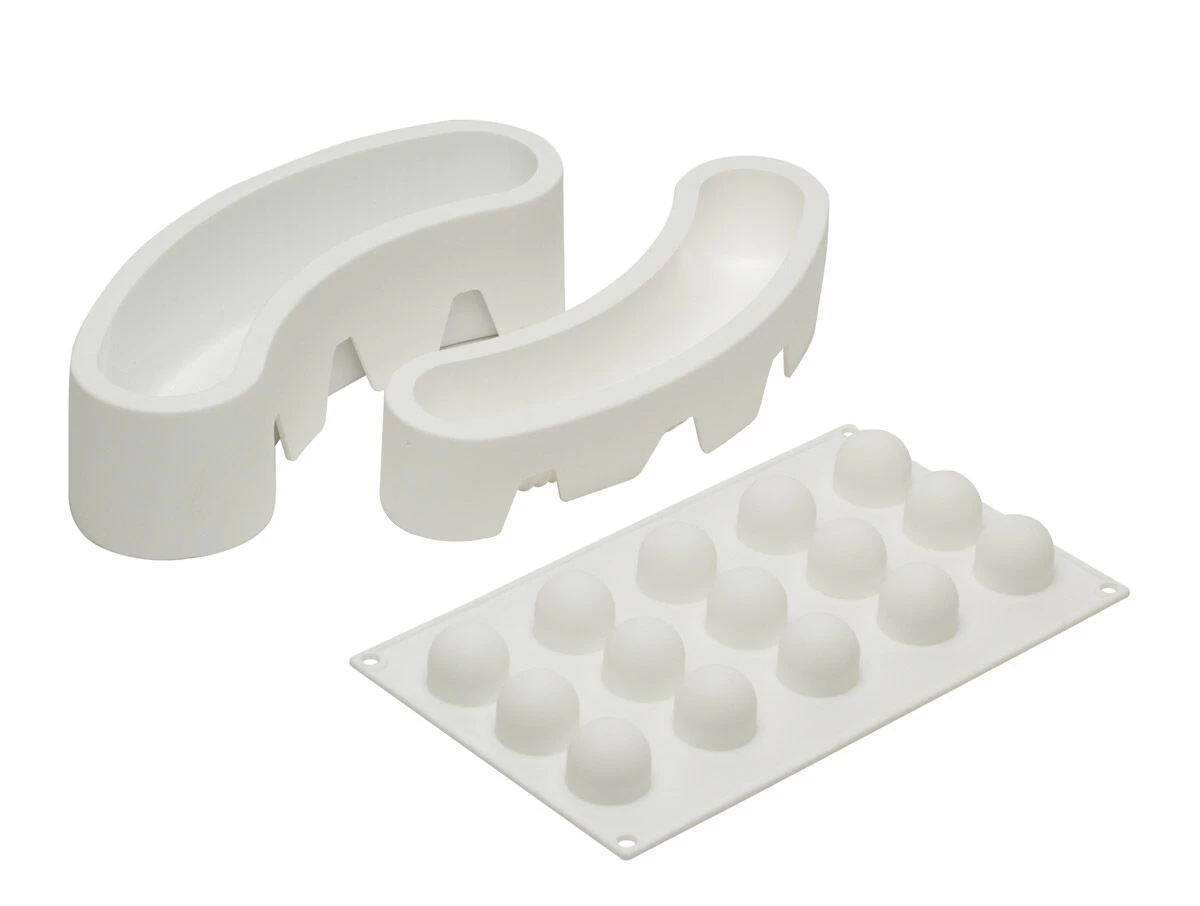 De Silikomart Professional bakvorm is vervaardigd uit hoogwaardig wit silicone en bestaat uit 3 delen. Met de set kunt u een zogenaamde ‘Stella del Circo’ maken; een lichtgekromd rechtopstaand gebak met losse bolletjes gebak of fruit erop. Voor het lichtgekromde gebak worden vormen in 2 maten geleverd: één van 27 x 5 x 5 cm met een inhoud van 584 ml en één van 28 x 6 x 7 cm met een inhoud van 1 liter. De vorm van 1 liter wordt geleverd met versteviging. Daarnaast is de set voorzien van een bakmat voor 15 bollen met een diameter van 3,2 cm. Deze bollen passen precies bovenop het gebak.