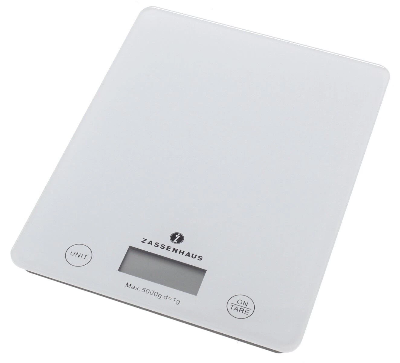 Deze Zassenhaus Balance weegschaal heeft een witte glazen bovenplaat en een weegmaximum van 5 kg. De weegschaal laat het juiste gewicht, met een nauwkeurigheid van 1 gram, op het LCD-scherm zien. Indien gewenst kan de Balance ook ounces en pounds weergeven. De weegschaal heeft een afmeting van 20,5 x 16,5 x 2 cm (l x b x h). Zodra de weegschaal in werking is getreden, dan blijft deze 1 minuut in werking.
